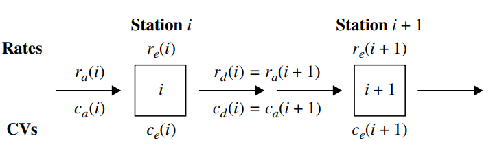 In a serial production line, each workstation's output feeds into the next(all the output from workstation i becomes input to workstation i + 1). It's crucial that the departure rate from one workstation matches the arrival rate of the next to maintain continuous production flow.
