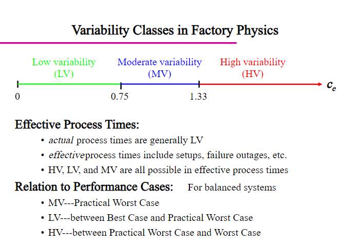 The key variable in Factory Physics is the effective process time(t_e) of a job at a workstation, denoted as "effective" because it encompasses the total time experienced by a job at a station(=actual working time, ex. 작업 시간 + 수리 시간)